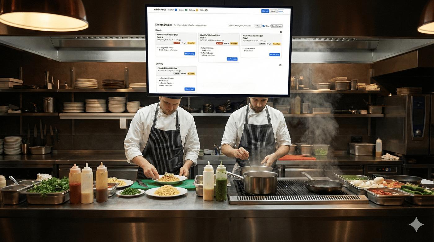 A Kitchen Display System connects Kitchen, Cashier, and Delivery into one clear flow — with real data and real visibility.